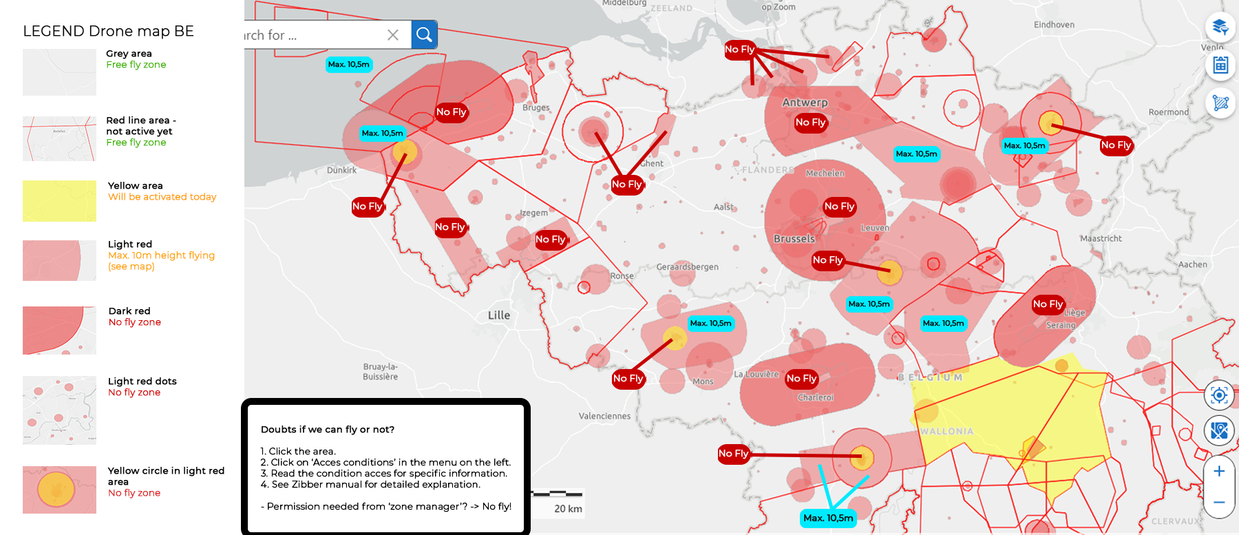 - NO-fly zones: donkerrood. Hier kunnen we NIET vliegen.